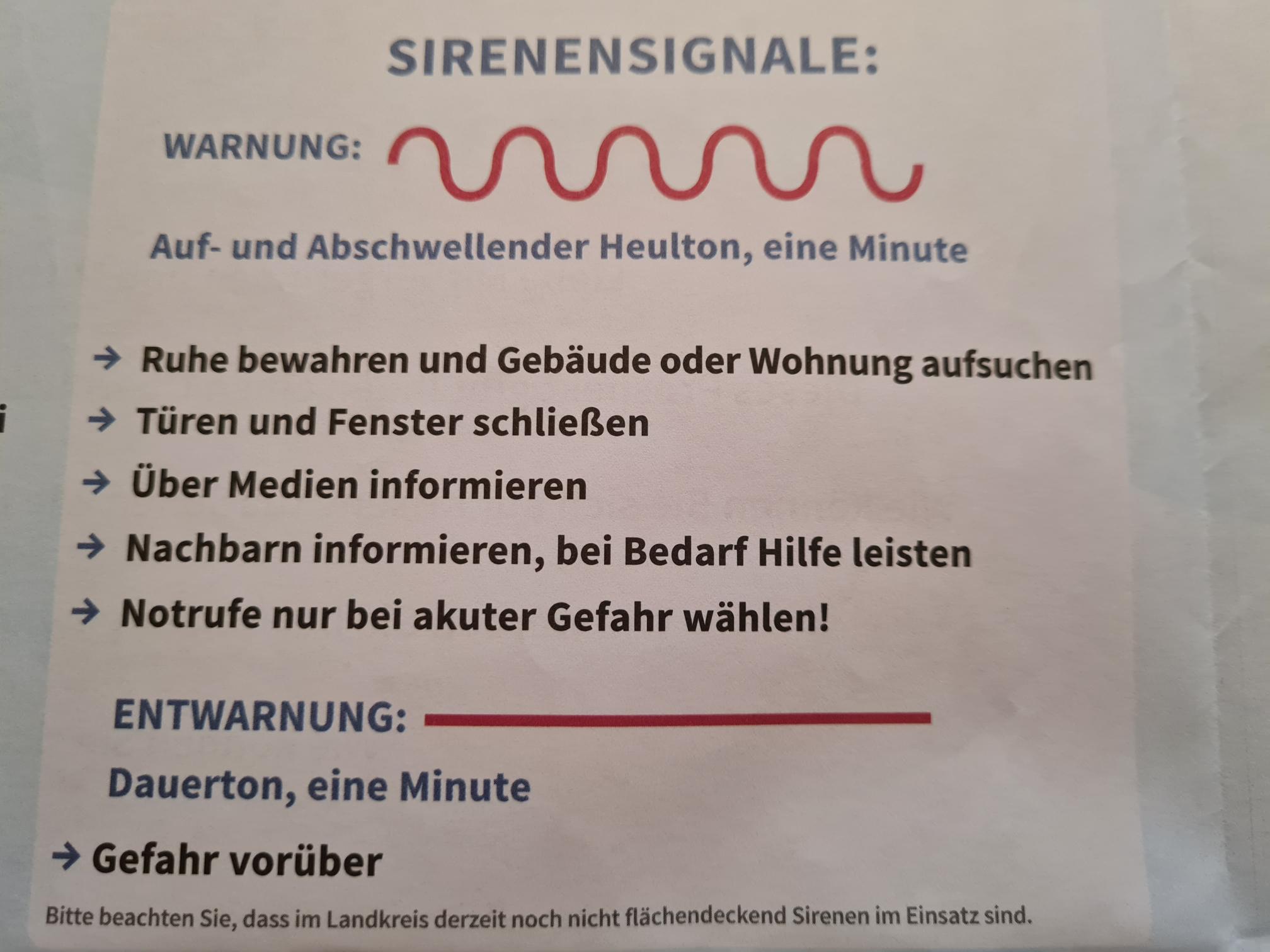 Das Signal „Eine Minute Heulton“ bedeutet im Ernstfall: In dem Gebiet besteht eine unmittelbare Gefahr oder die Gefahr ist in Kürze zu erwarten. Nutzen Sie alle möglichen Informationsmedien für weitere Hinweise, diese werden z. B. von allen lokalen und regionalen Rundfunksendern ausgestrahlt. Folgen Sie den amtlichen Anweisungen.“