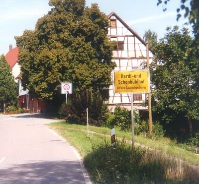 Der Hardt- und Schönbühlhof ist ein in Baden-Württemberg einmaliger Ort. Mitten durch den Weiler, ja mitten durch Häuser, geht die Gemarkungsgrenze von Schwieberdingen und Markgröningen.